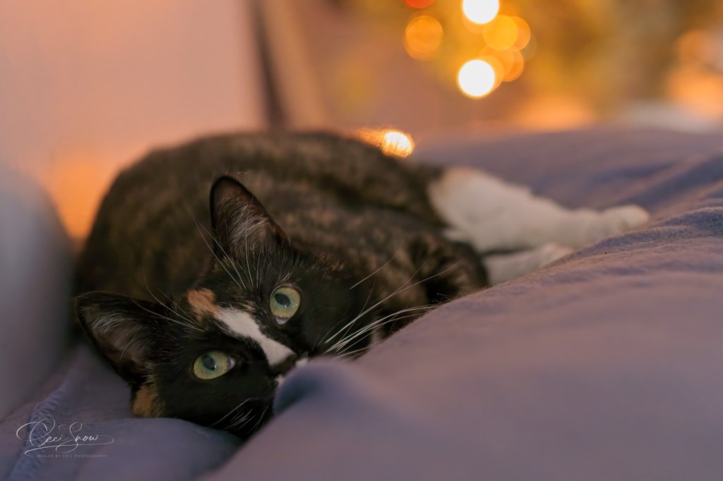 Lucy chose to snooze on the back of the couch in the glow of the Christmas tree lights. She’s trying valiantly to ignore the chaos outside.